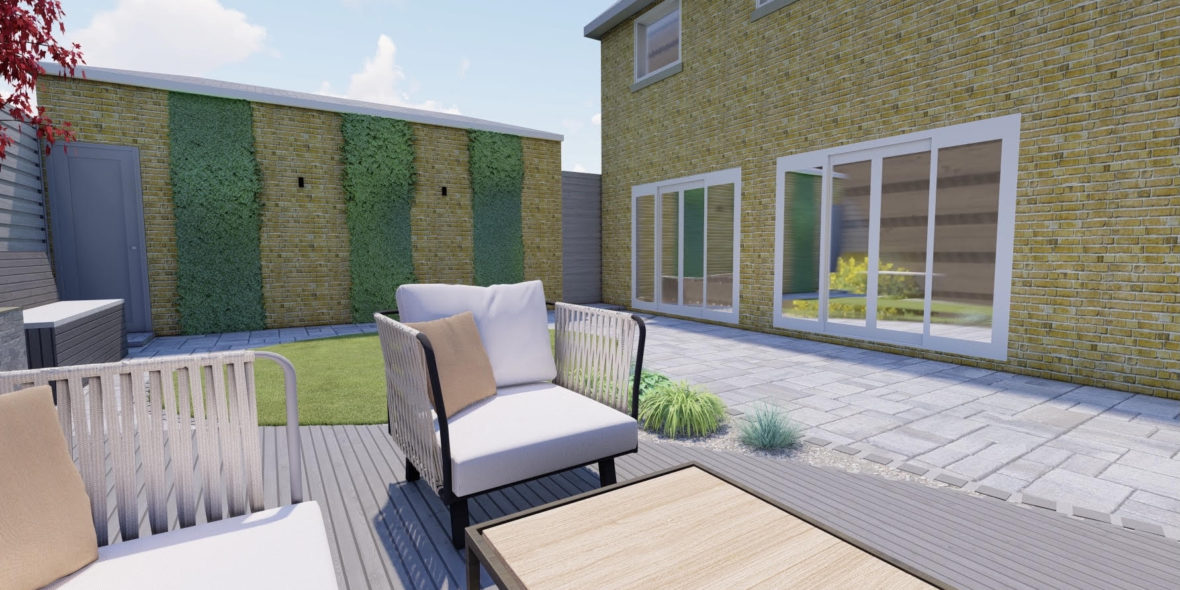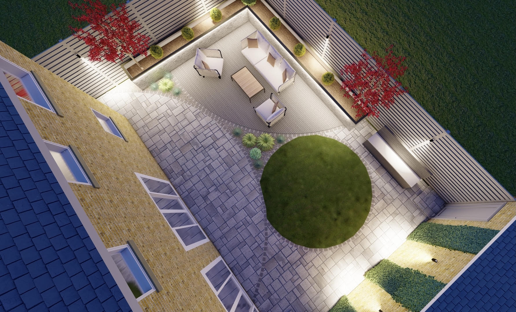 Luxury , low maintenance, garden designed over one level introducing a circular theme to define different areas of the garden, which helps to maximise this small space.