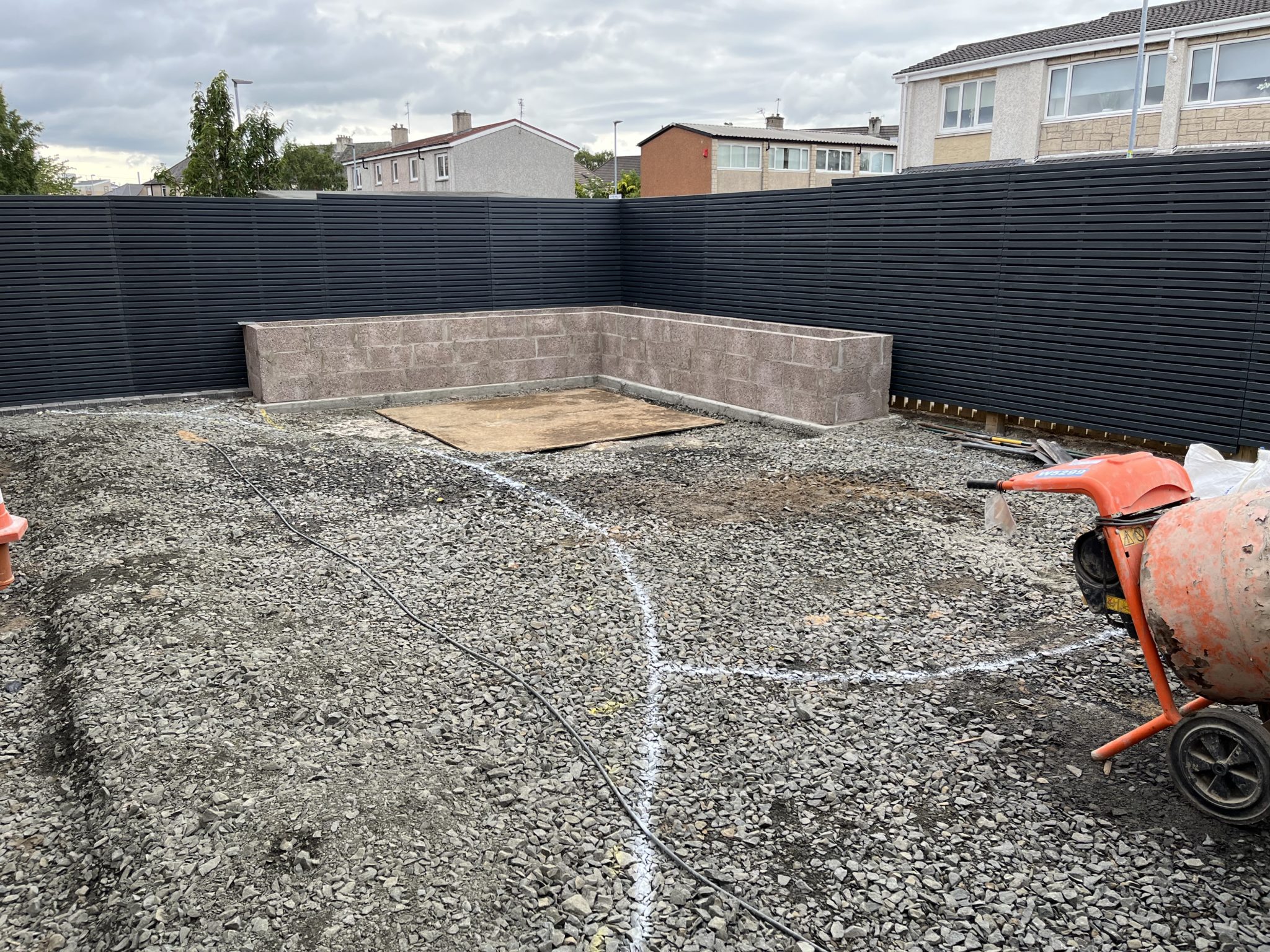 We ripped out the existing garden with the use of a 1.6ton mini digger, 1 machine operator and 1 banks man. 22ton of spoil was removed from the area using a clam lorry and 10ton of type 1 mot was used as the initial layer of sub base which was laid on weed suppressing membrane and compacted using a vibrating plate. The next step was to erect the contemporary screens to define the perimeter as well as liaise with CS Electrical for their first fix installation of the armoured cable.